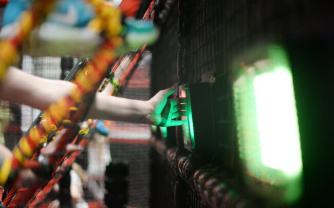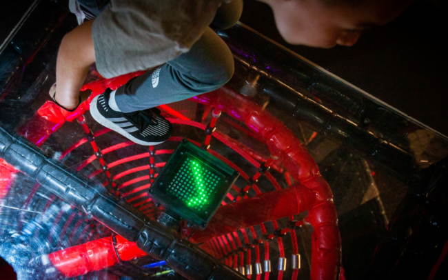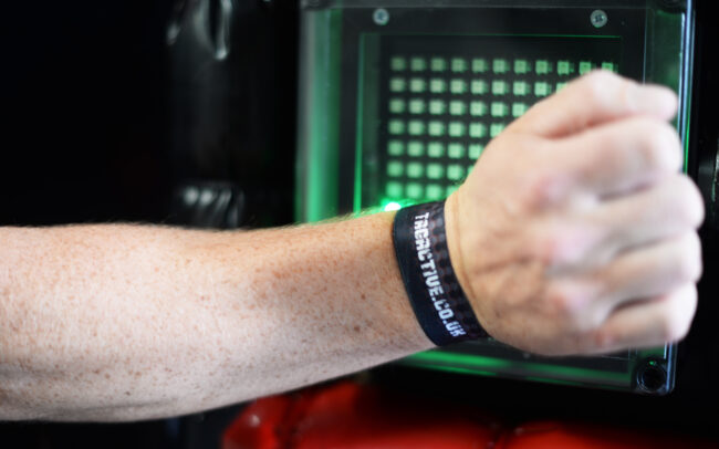 Hidden throughout the arena and within the activities are a large number of illuminated TAG’s. The TAG’s are controlled via a central computer system and glow in different colours corresponding to a pre-determined points system. Points are collected by players using a sensor worn as a wristband. When a wristband is located onto a TAG’s light source, a point’s value is allocated to the specific player’s wristband. As the player identifies and reaches more TAG’s the players score escalates.